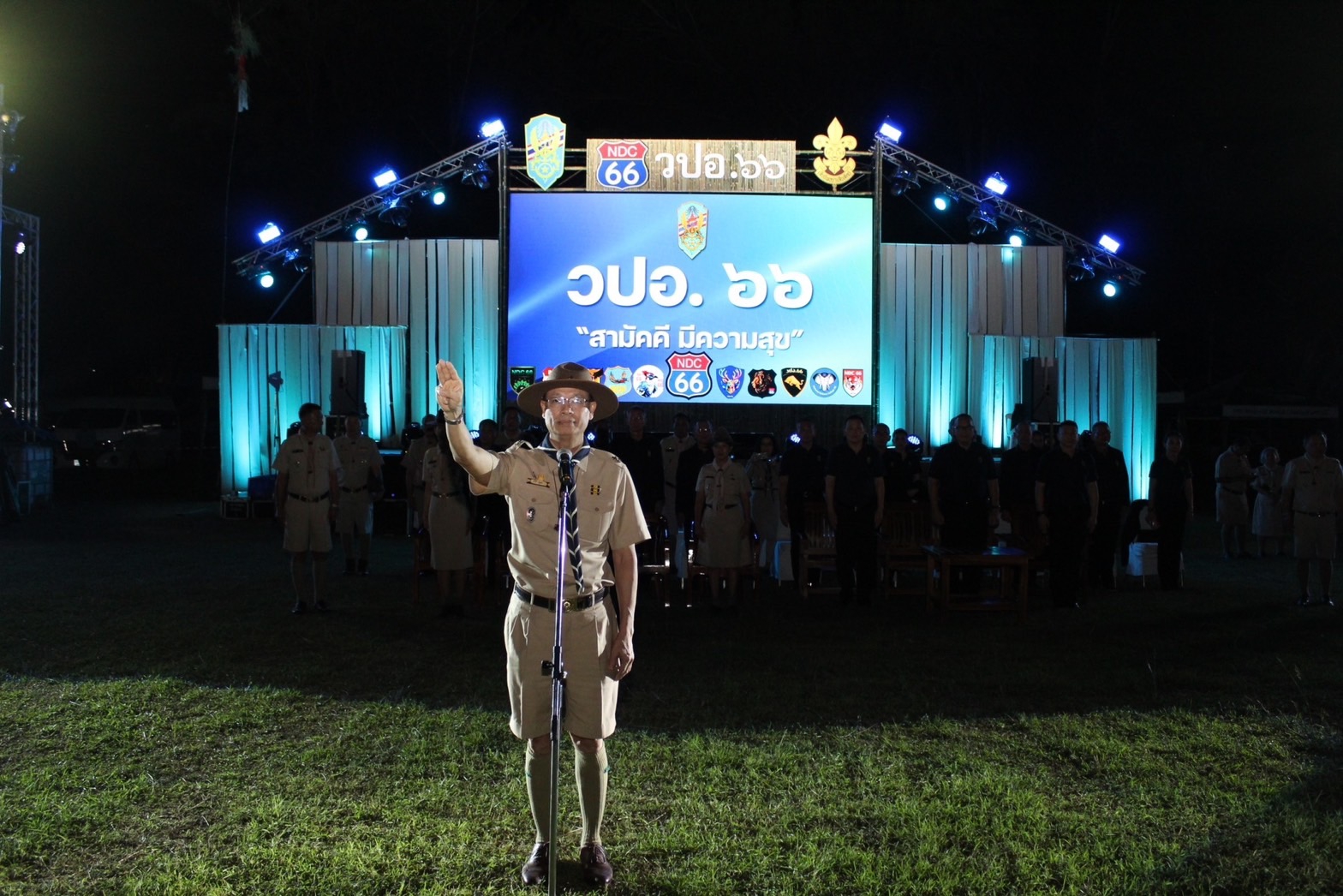 วันพุธที่ 1 พฤศจิกายน 2566 ณ ค่ายลูกเสือวชิราวุธ อ.ศรีราชา จ.ชลบุรี ตามที่หลักสูตรการป้องกันราชอาณาจักร รุ่นที่ 66 (วปอ. 66) ได้จัดการอบรมบุคลากรทางการลูกเสือ ระดับผู้นำ ชั้นความรู้ชั้นสูง นักศึกษาวิทยาลัยป้องกันราชอาณาจักร 2566 ระหว่างวันที่ 30 ตุลาคม - 3 พฤศจิกายน 2566 โดยได้มีการจัดกิจกรรมรอบกองไฟ เพื่อสร้างความสัมพันธ์อันดีของผู้เข้ารับการศึกษาหลักสูตร วปอ. พร้อมคิดค้นการแสดงตามหัวข้อต่างๆ ของแต่ละหมู่ เพื่อเสริมสร้างความสามัคคีในหมู่คณะให้แน่นแฟ้นยิ่งขึ้น โดยมี นายปรีดี ภูสีน้ำ รักษาราชการแทน เลขาธิการ สลช. (สำนักงานลูกเสือแห่งชาติ) และผู้ตรวจราชการกระทรวงศึกษาธิการ ให้เกียรติเป็นประธานในพิธีเปิดกิจกรรมรอบกองไฟในครั้งนี้